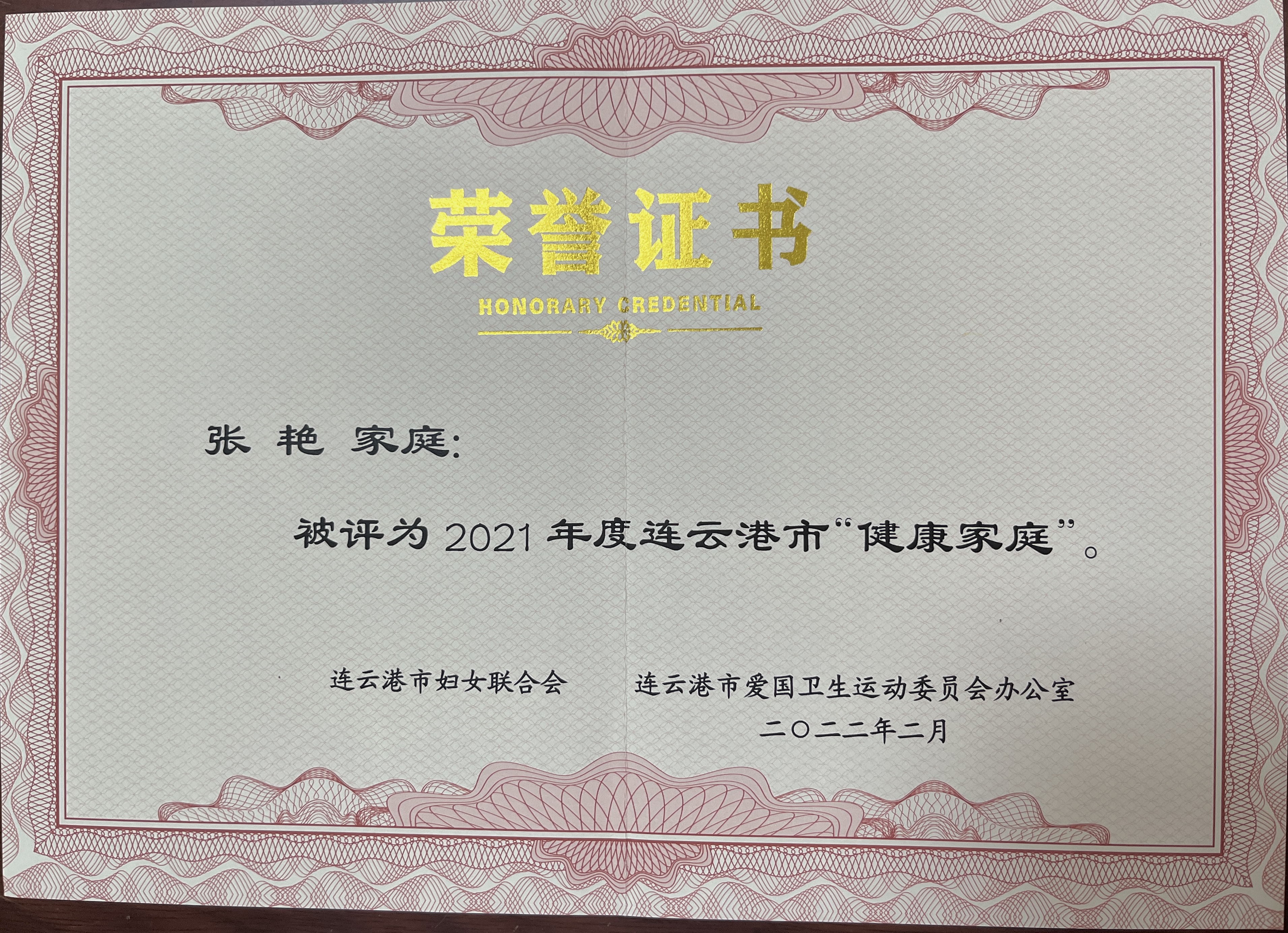 日前,連云港市婦聯(lián)、市愛(ài)衛(wèi)辦聯(lián)合開(kāi)展了2021年度健康家庭推選活動(dòng),通過(guò)組織推薦,汽服公司基層工會(huì)干部張艷的家庭被評(píng)為“2021年度連云港市健康家庭”。