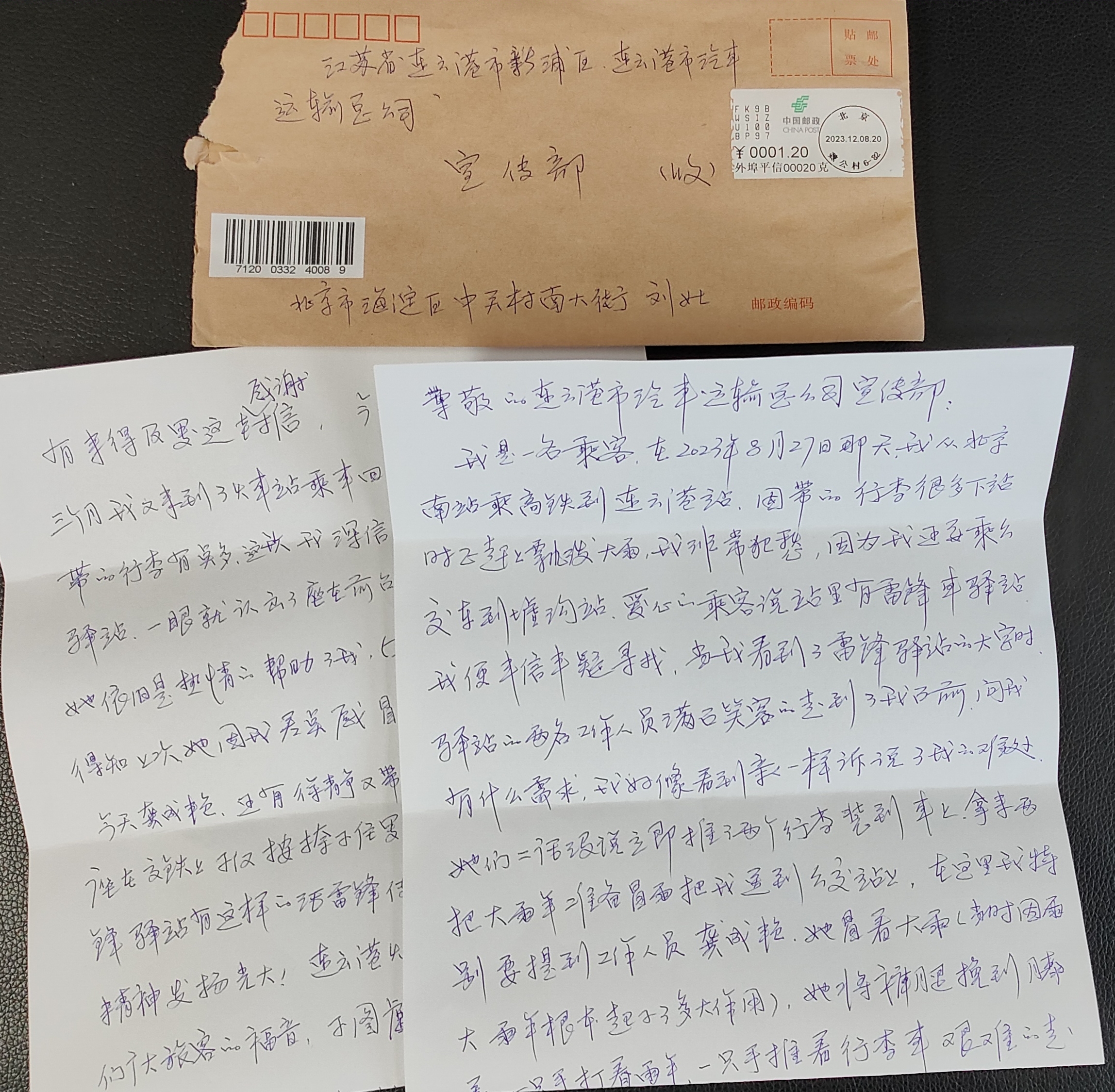 近日,連汽公司“雷鋒車”驛站收到了來自七旬旅客劉女士的感謝信。信中,劉女士感激地描述了自己在8月份到連云港高鐵站轉(zhuǎn)乘時(shí),遇到了大雨和行李多的困難。就在她發(fā)愁的時(shí)候,熱心旅客告訴她可以找“雷鋒車”驛站工作人員幫忙。