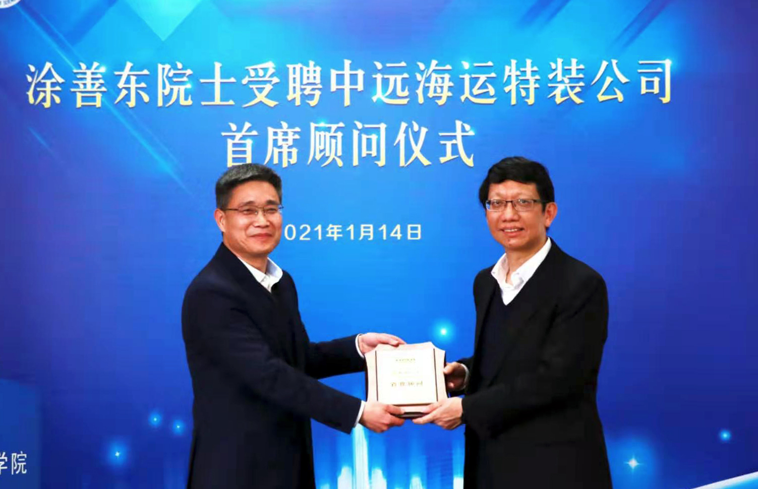 1月14日,中國工程院院士涂善東接受物流集團屬中遠海運特裝公司聘請,擔任公司首席顧問。交通控股集團總經(jīng)理、中遠海運特裝公司董事長仲偉濤為涂善東院士頒發(fā)聘任牌匾。