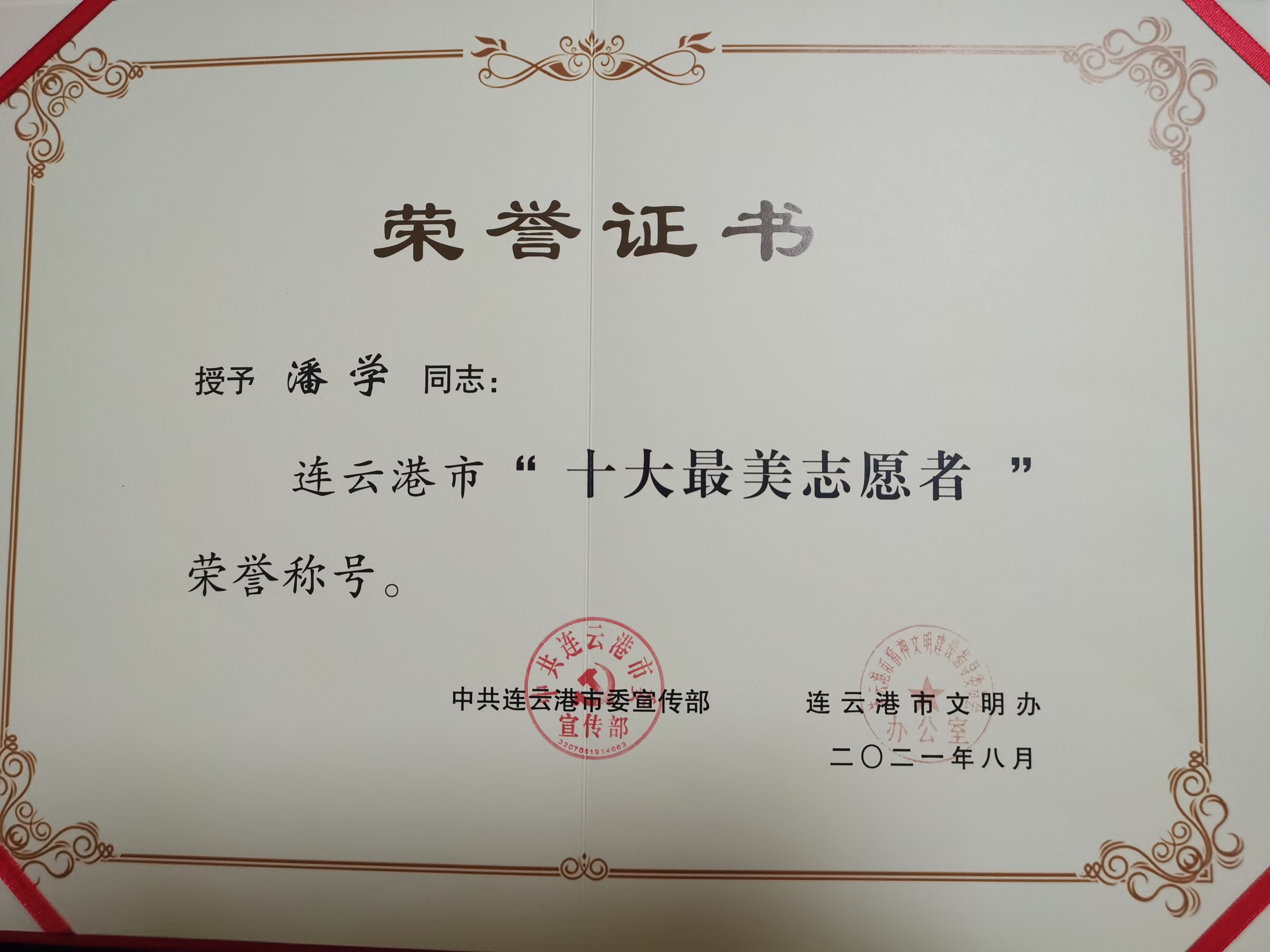 市委宣傳部、市文明辦組織開展的連云港市“十大最美志愿者”推選評(píng)比活動(dòng)中,經(jīng)過組織發(fā)動(dòng)、推薦上報(bào)、材料初審、征求相關(guān)部門意見、專家評(píng)審、網(wǎng)絡(luò)投票等環(huán)節(jié),連汽站務(wù)事業(yè)部潘學(xué)同志榮獲“十大最美志愿者”榮譽(yù)稱號(hào)。