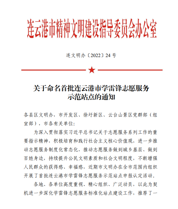針對(duì)此次命名,連云港市文明辦強(qiáng)調(diào)各站點(diǎn)要充分發(fā)揮學(xué)雷鋒志愿服務(wù)示范站點(diǎn)的示范引領(lǐng)作用,在推動(dòng)志愿服務(wù)制度化、規(guī)范化、常態(tài)化上下功夫,大力培育志愿服務(wù)文化,不斷提升公民道德素質(zhì)和社會(huì)文化程度,為推動(dòng)新時(shí)代的“后發(fā)先至”、建設(shè)人民期待的現(xiàn)代化新港城凝聚強(qiáng)大精神力量。