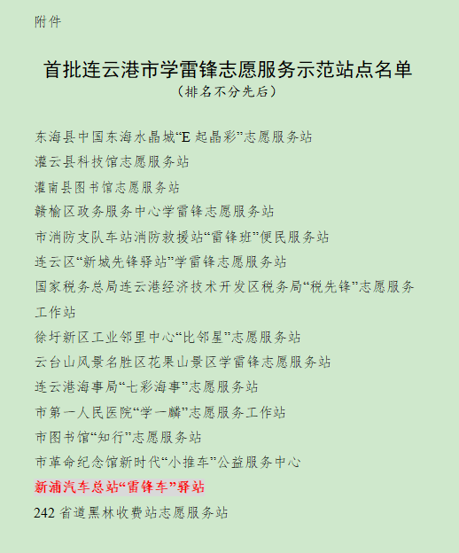 近日,連云港市文明辦命名了首批連云港市學(xué)雷鋒志愿服務(wù)示范站點(diǎn)15個(gè),覆蓋眾多行業(yè)及領(lǐng)域。其中,連汽新浦汽車總站“雷鋒車”驛站成功入選。