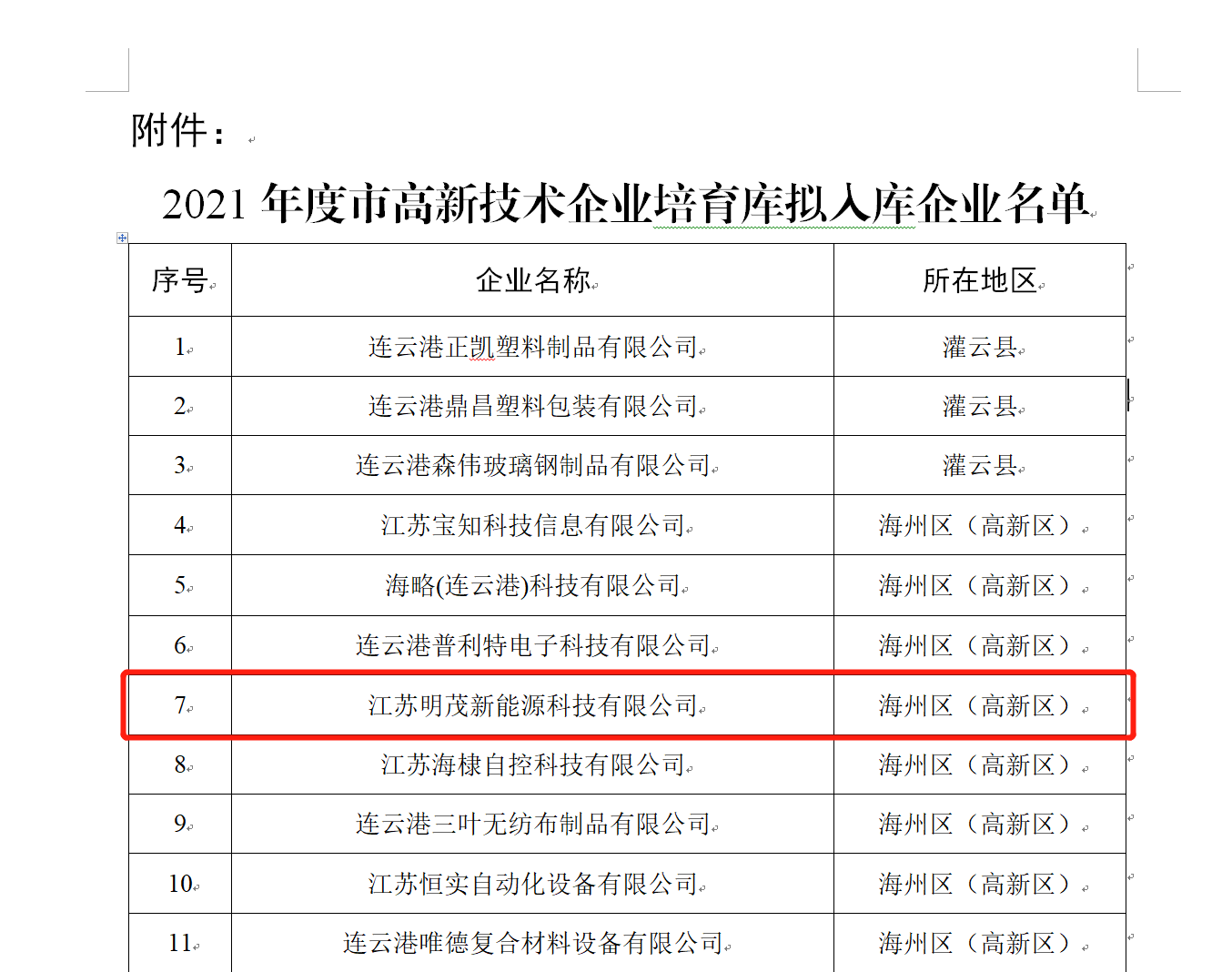 明茂公司緊盯高新技術(shù)企業(yè)申報政策,統(tǒng)籌協(xié)調(diào)穩(wěn)步推進(jìn)申報工作,經(jīng)市科技部門初審、組織專家評審、綜合審查推薦等程序,2021年10月31日,順利通過連云港市高新技術(shù)企業(yè)培育庫2021年度入庫公示。