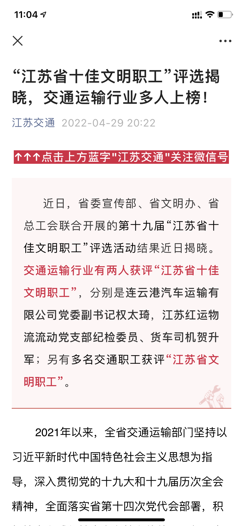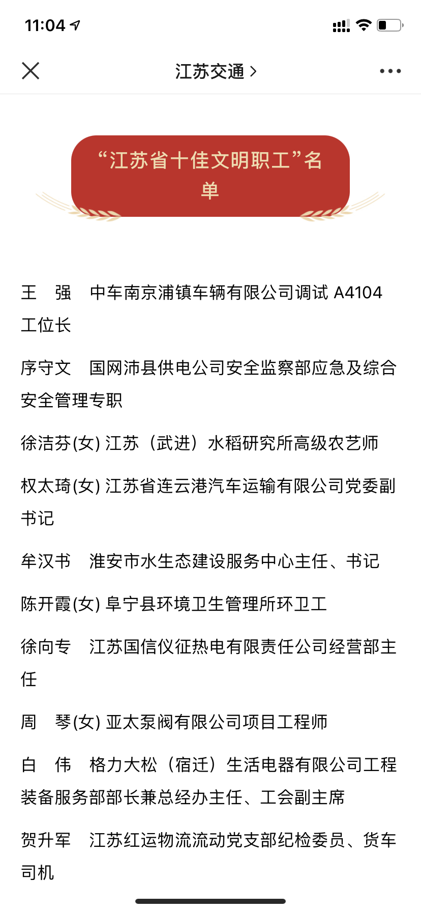 經過基層推薦、報紙網絡公示、群眾點贊和專家評審等程序,新浦汽車總站權太琦同志榮獲“江蘇省十佳文明職工”稱號!