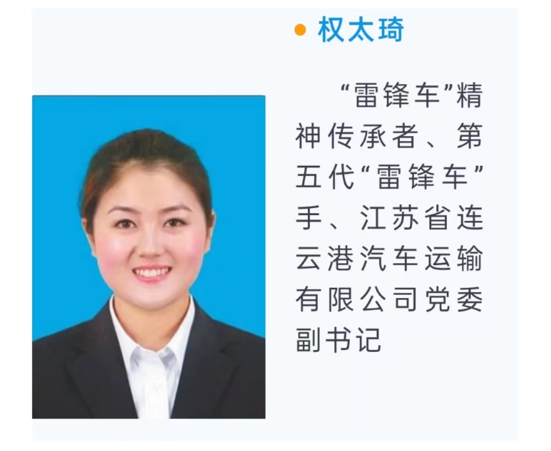 權太琦,女,漢族,1984年10月生,中共黨員,全國重大典型“雷鋒車”組第五代“雷鋒車”手,汽車公司黨委副書記、新浦汽車總站“雷鋒車”組黨支部書記,江蘇省勞動模范,第十二屆、十三屆全國人大代表,曾榮獲“全國優(yōu)秀共產黨員” “江蘇省優(yōu)秀共產黨員”等榮譽。
