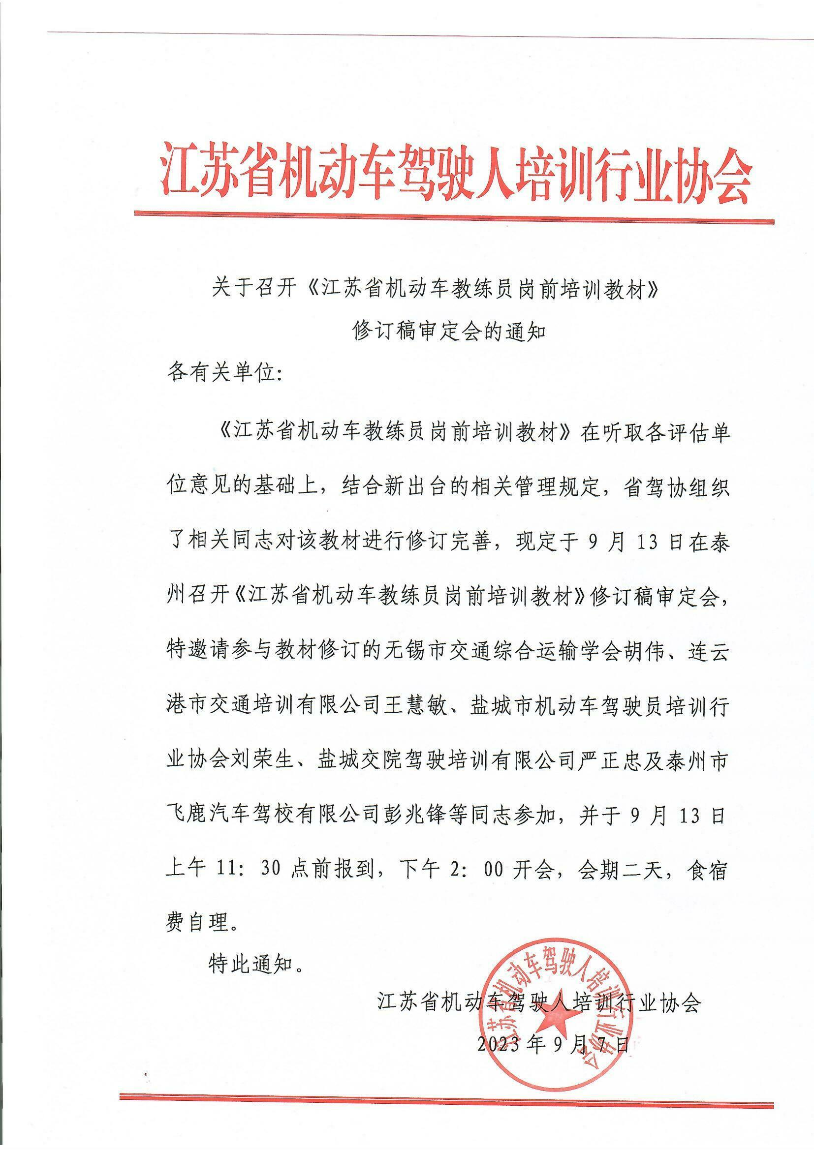 9月13日,《江蘇省機(jī)動(dòng)車教練員崗前培訓(xùn)教材》修訂稿審定會(huì)在江蘇泰州召開(kāi)。交培公司駕培事業(yè)部王慧敏同志作為江蘇省駕駛?cè)诵袠I(yè)協(xié)會(huì)專家組成員,受邀參加《江蘇省機(jī)動(dòng)車教練員崗前培訓(xùn)教材》修訂稿審定工作。