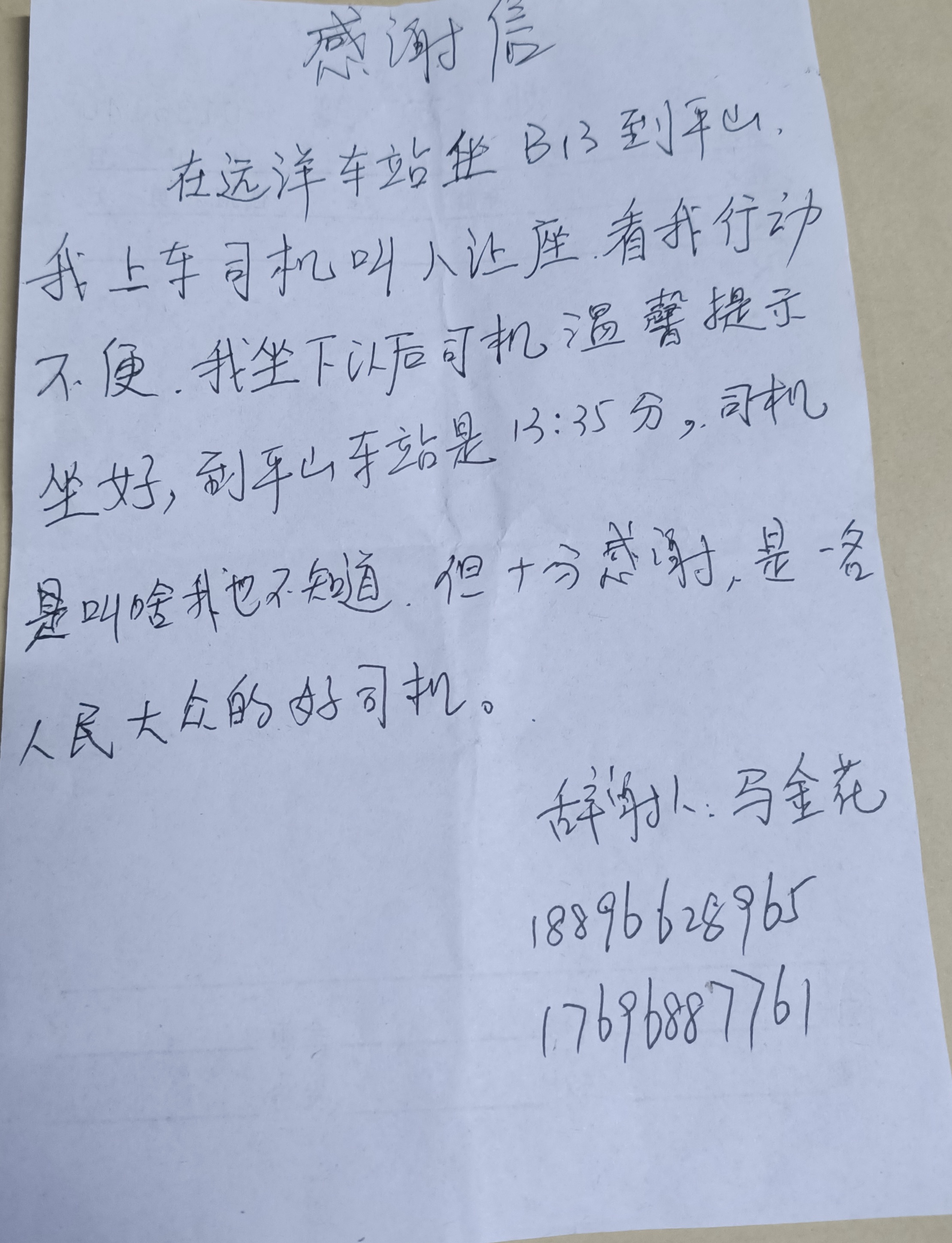 原來(lái),7月29日中午13:00左右,市民馬阿姨因腰部疼痛要到平山診療室去針灸治療。當(dāng)她在遠(yuǎn)洋樓站乘坐B13車時(shí),因腰部疼痛,上車時(shí)特別吃勁,駕駛員曹華偉一直耐心等待,讓她不要著急,上車后又主動(dòng)幫她找座位,還請(qǐng)其他乘客幫忙攙扶坐好后才繼續(xù)運(yùn)營(yíng)。在得知馬阿姨到平山站下車時(shí),曹華偉又特意將車一點(diǎn)一點(diǎn)貼近站臺(tái)停靠,以方便馬阿姨下車并叮囑她注意安全。這讓馬阿姨特別感動(dòng),她在電話中激動(dòng)地說(shuō),“我活了62年,坐了這么多年公交車,從來(lái)沒有遇到過(guò)這樣好心的駕駛員,不僅服務(wù)熱情還特別有親切感,對(duì)待乘客就像對(duì)待自己的家人一樣,他的一聲聲關(guān)懷、叮囑深深溫暖了我的心,讓我內(nèi)心感動(dòng)至極?!庇谑撬谙萝嚂r(shí)特意看了一下站臺(tái)時(shí)間13:35,當(dāng)她到診療室后,又第一時(shí)間向醫(yī)院要了張紙寫下了這封感謝信,生怕自己因年紀(jì)大而忘記此事。在診療完后,拜托站務(wù)員將這封感謝信帶到東城調(diào)度室以表達(dá)她的感謝之意。