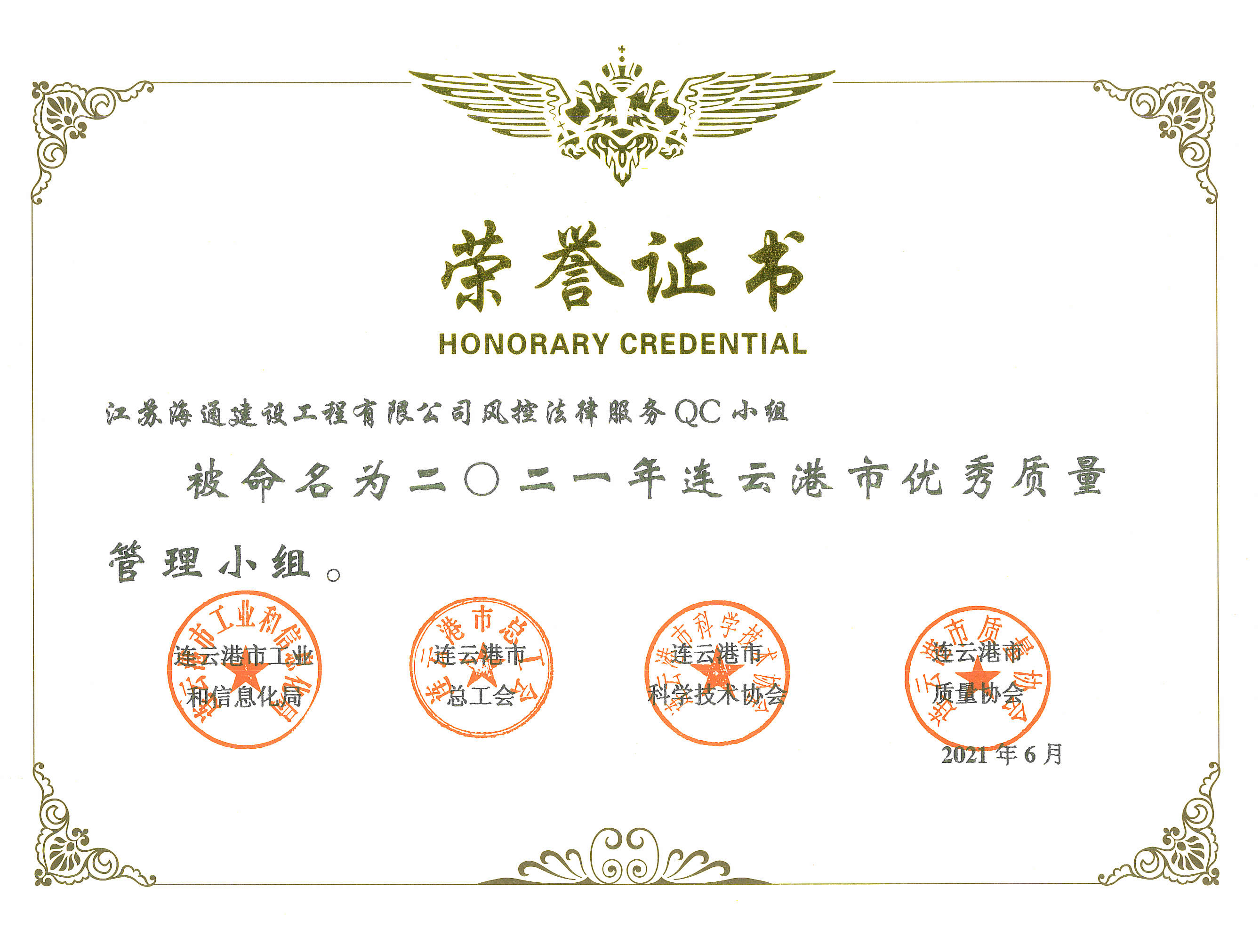 近日,根據(jù)市工信局、總工會、科協(xié)、質量協(xié)會聯(lián)合下發(fā)的《關于表彰2021年連云港市優(yōu)秀質量 管理小組、質量信得過班組、優(yōu)秀企業(yè)、卓越領導者、優(yōu)秀推進者的通知(連工信發(fā)〔2021〕101號)》文件獲悉,江蘇海建公司集思廣益QC小組、只爭朝夕QC小組和風控法律服務QC小組被命名為2021年連云港市優(yōu)秀質量管理小組。