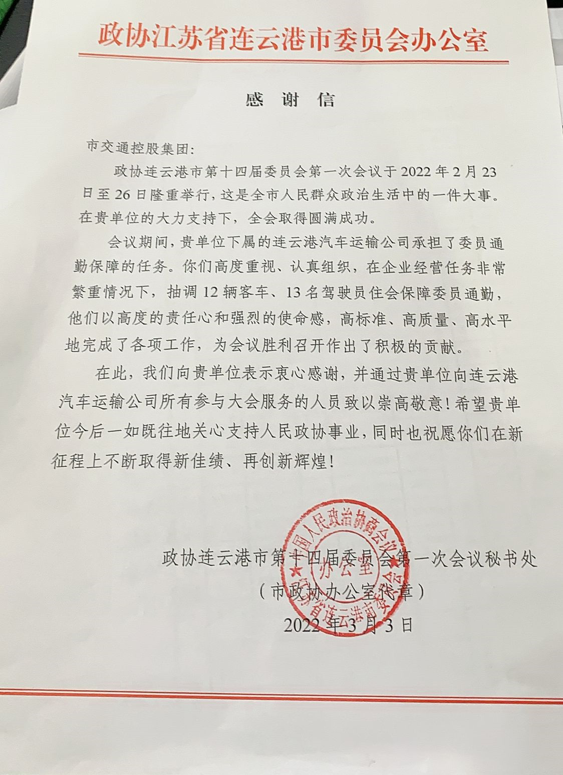 近日,從市交通控股集團(tuán)獲悉,政協(xié)連云港市第十四屆委員會(huì)第一次會(huì)議秘書處發(fā)來(lái)感謝信,對(duì)汽車公司在第十四屆委員會(huì)第一次會(huì)議中的交通保障工作表示衷心感謝,對(duì)公司所有參與大會(huì)服務(wù)的人員致以崇高的敬意。
