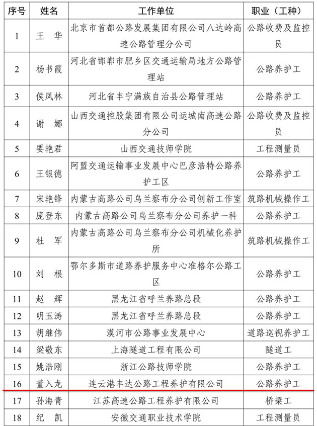 近日,交通運輸部公布2021年度全國交通技術能手評審結果,連云港市交通控股集團豐達養(yǎng)護公司公路養(yǎng)護工董入龍同志榮譽“全國交通技術能手”稱號。據悉,全國僅有245名同志獲此榮譽。