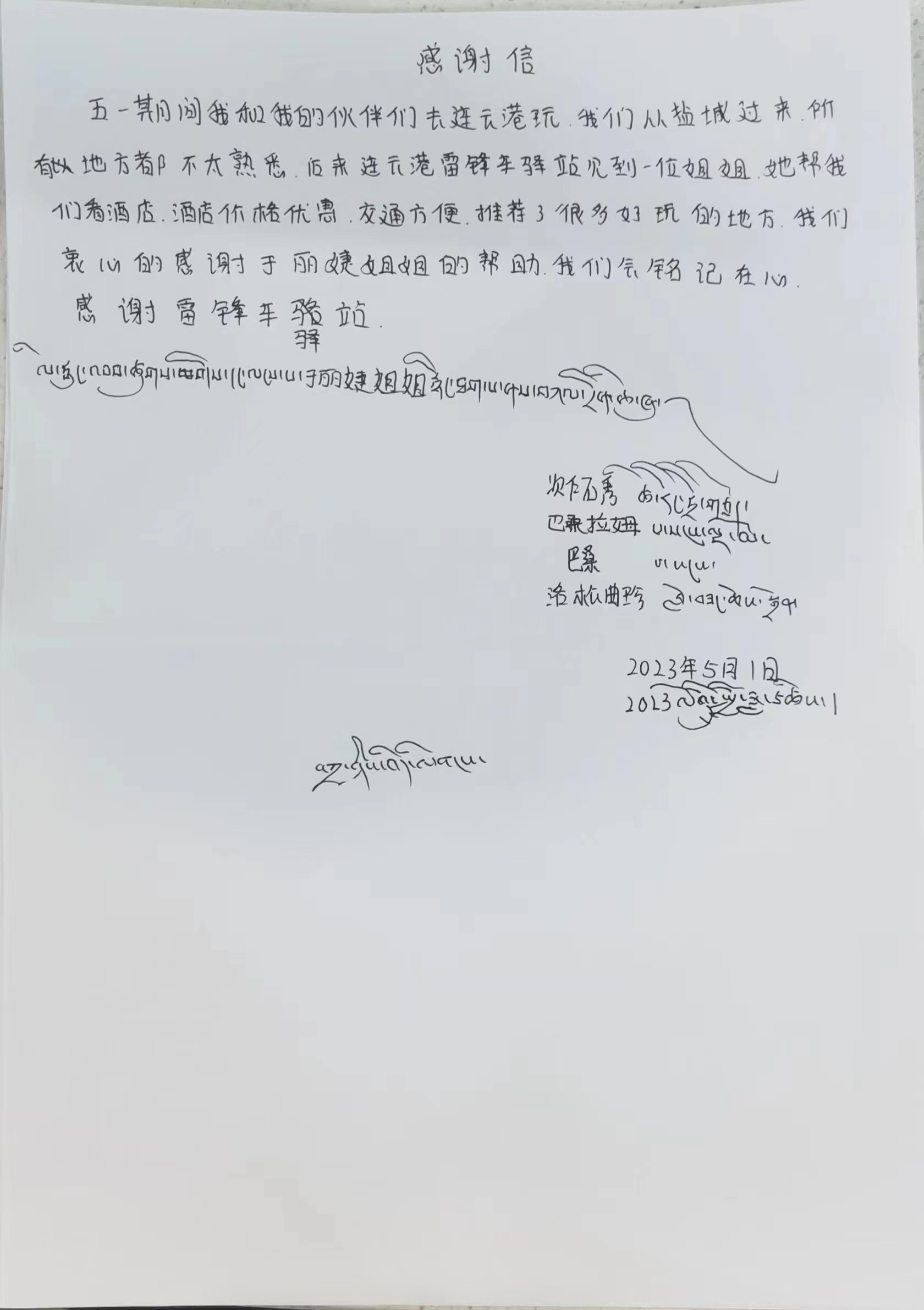 5月1日,連汽“雷鋒車”驛站收到了一封手寫的感謝信。寫感謝信的是四位外地來連游玩的大學生,她們在信中對“雷鋒車”驛站的志愿者于麗捷熱情、友愛、助人的工作作風深表謝意。感激之余,四位大學生寫下了這樣一封感謝信。