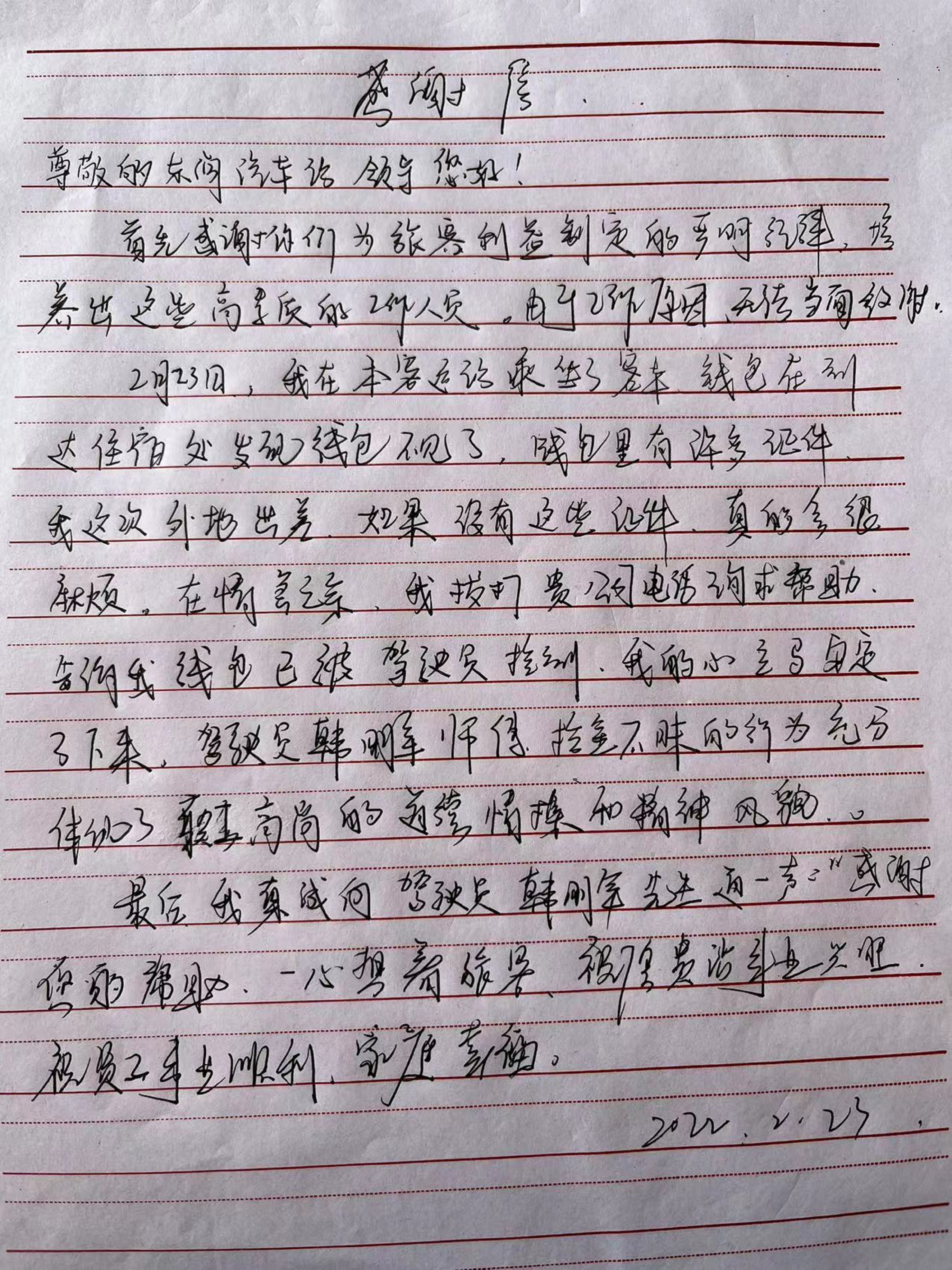 2月24日上午,連汽東海公司值班室收到一封乘客送來的親筆感謝信,信中張先生對駕駛員韓明軍以及東海公司員工拾金不昧和貼心服務(wù)表示感謝。表明由于工作原因無法當(dāng)面致謝,只能通過親手寫封感謝信的方式來表達(dá)自己的感激之情。