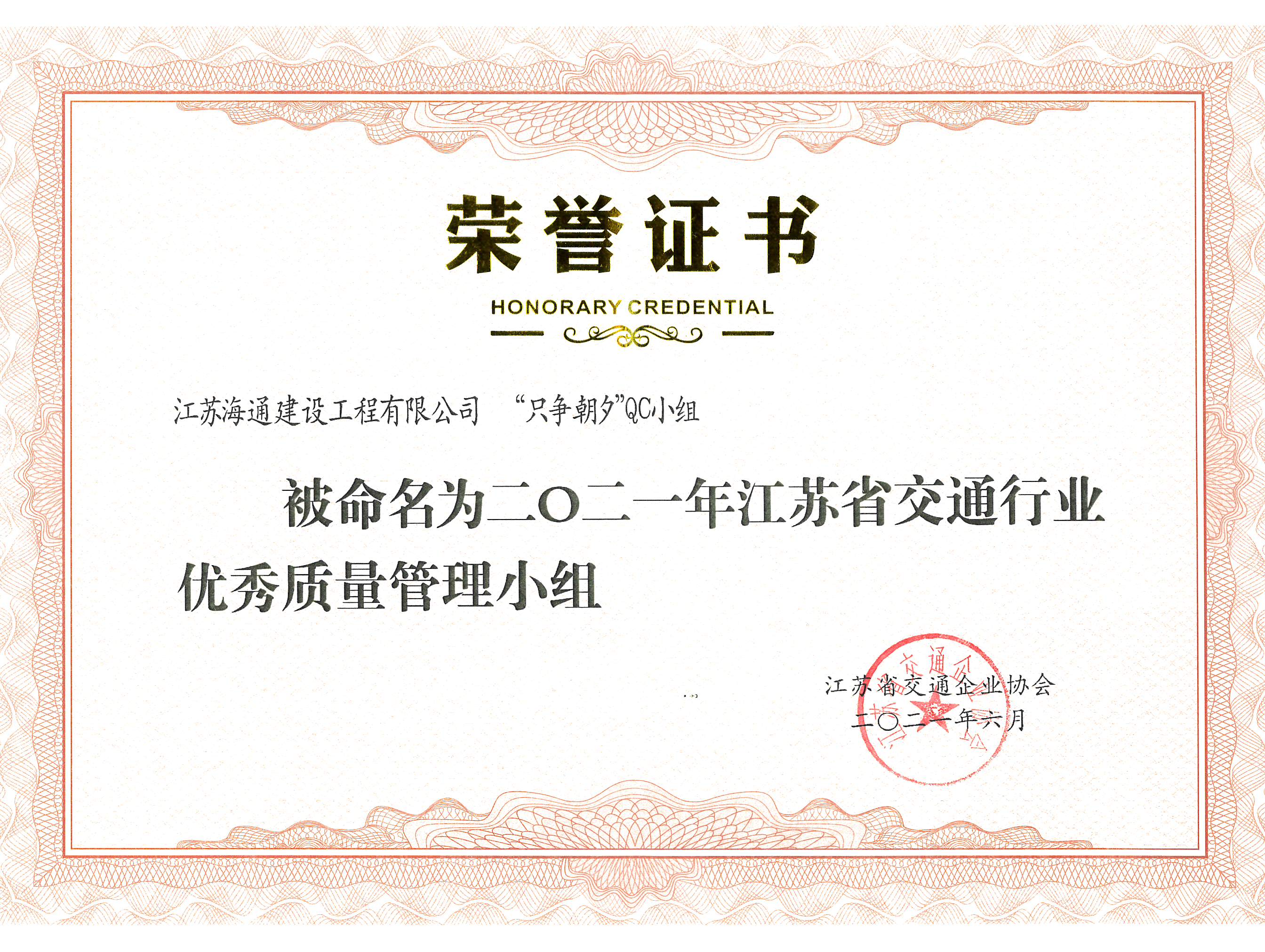 近日,江蘇省交通企業(yè)協(xié)會(huì)公布了《關(guān)于公布2021年度江蘇省交通行業(yè)優(yōu)秀質(zhì)量管理小組評(píng)選結(jié)果的通知》、《關(guān)于公布江蘇省交通運(yùn)輸行業(yè)2021年度優(yōu)秀QC小組活動(dòng)成果獲獎(jiǎng)名單的通知》,江蘇海建公司只爭朝夕QC小組被評(píng)為2021年度江蘇省交通行業(yè)優(yōu)秀質(zhì)量管理小組,集思廣益QC小組及成果《提高波形梁護(hù)欄安裝合格率》被評(píng)為2021年度江蘇省交通行業(yè)優(yōu)秀質(zhì)量管理小組、2021年度優(yōu)秀QC小組活動(dòng)成果三等獎(jiǎng)。