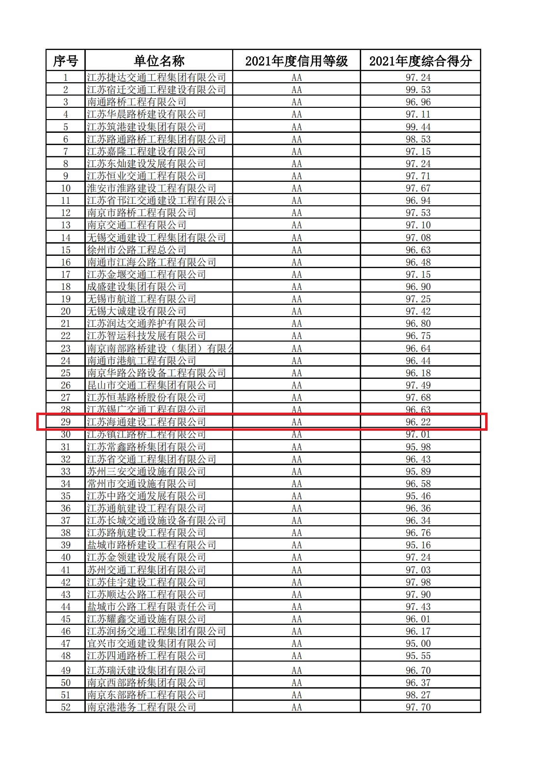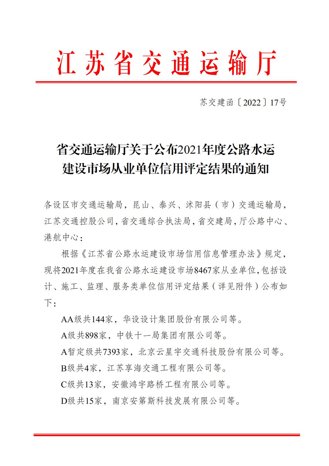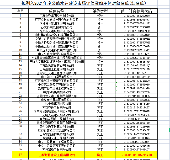 近日,從江蘇省交通運(yùn)輸廳相繼公布的《2021年度公路水運(yùn)建設(shè)市場(chǎng)從業(yè)單位信用評(píng)定結(jié)果》和《2021年度公路水運(yùn)建設(shè)市場(chǎng)守信激勵(lì)和嚴(yán)重失信主體對(duì)象名單》文件中獲悉,江蘇海通建設(shè)工程有限公司2020年度、2021年度連續(xù)兩年被評(píng)定為江蘇省公路水運(yùn)建設(shè)市場(chǎng)“AA”信用單位,并進(jìn)入江蘇省公路水運(yùn)建設(shè)市場(chǎng)守信激勵(lì)單位名單(“紅名單”),這是本企業(yè)成立以來(lái)獲得的最高信用評(píng)價(jià),也是連云港市唯一獲此兩項(xiàng)殊榮的公路水運(yùn)施工企業(yè)。