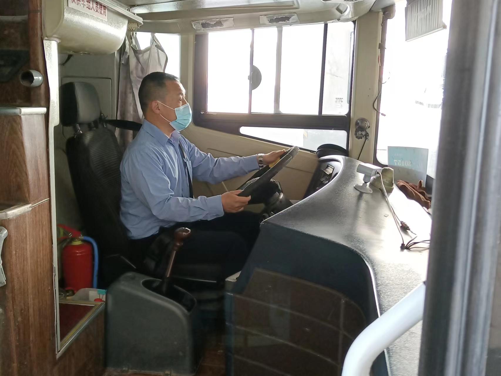 清晨4點30分,尚明早早起床,提前來到停車場,開始進行發(fā)車前的安全檢查,輪胎、水箱、機油……隨后,又拿起拖把、笤帚認真打掃起車輛,受疫情影響,每次車輛的消毒保潔工作尚明都做得十分仔細,特別針對乘客接觸較多的扶手、座椅等部位進行重點消毒,隨后打開車窗,讓車廂通風(fēng)。消毒后開始一天的工作,尚明將車輛開到乘車地點迎接員工上下班。