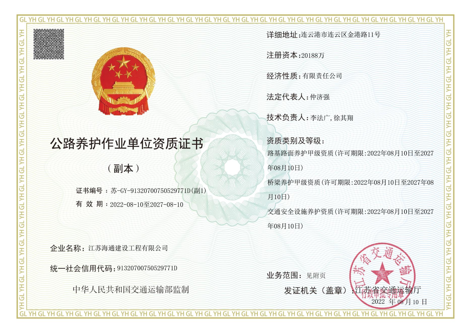 近日,江蘇海建公司增項(xiàng)公路養(yǎng)護(hù)作業(yè)資質(zhì)工作傳來(lái)佳音,經(jīng)江蘇省交通運(yùn)輸廳核準(zhǔn),公司申報(bào)的路基路面養(yǎng)護(hù)甲級(jí)、橋梁養(yǎng)護(hù)甲級(jí)級(jí)、交通安全設(shè)施養(yǎng)護(hù)資質(zhì)成功獲批并取得證書(shū)。