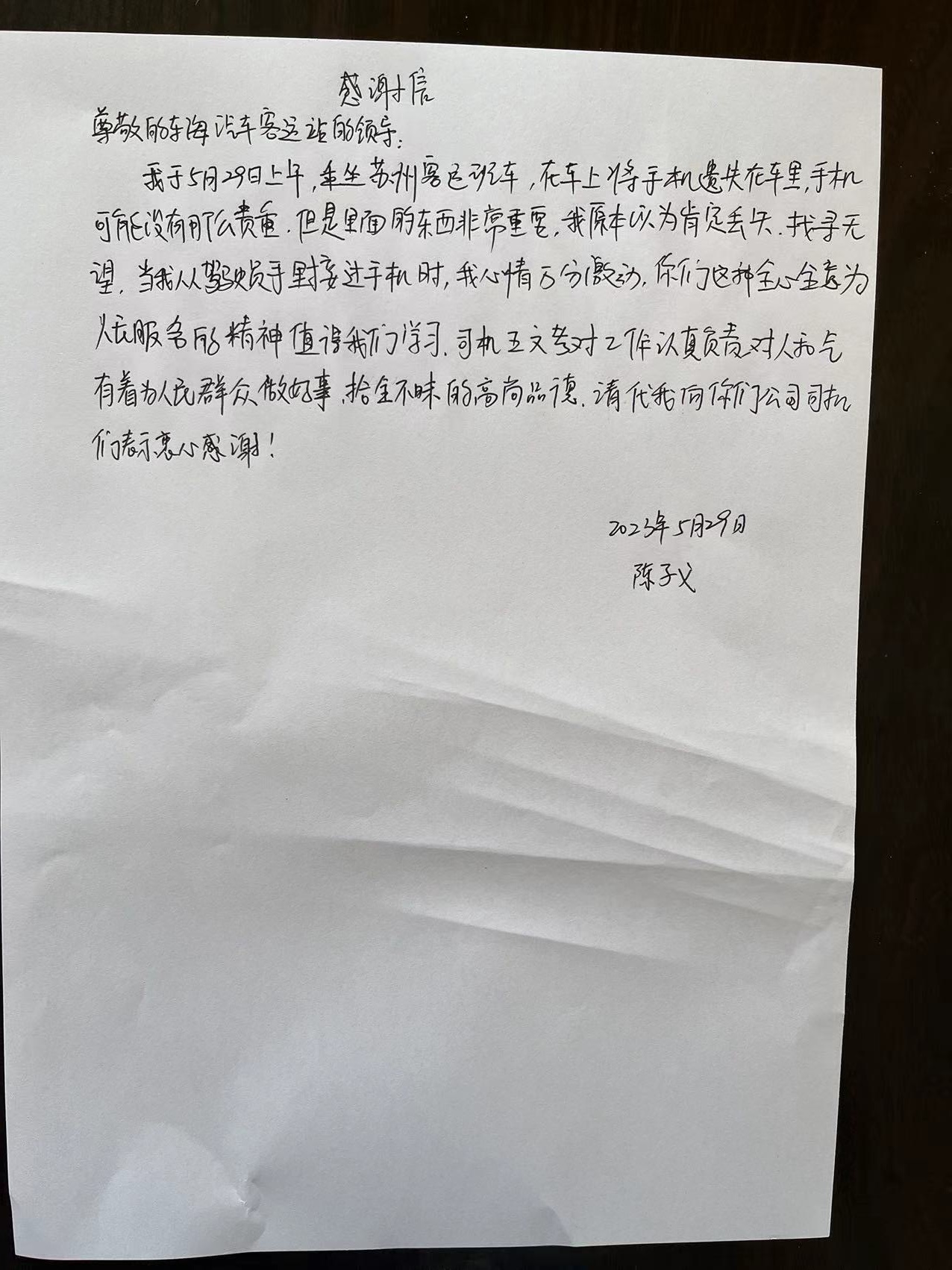 5月30日下午,連汽東海分公司收到一位大學(xué)生的感謝信,感謝蘇州班線駕駛員王文考拾金不昧、樂于助人的好品德。感謝信中寫到:“你們這種全心全意為人民服務(wù)的精神值得我們學(xué)習(xí),王文考師傅對工作認(rèn)真負(fù)責(zé),對人和氣,有著為人民群眾做好事、拾金不昧的高尚品德,請代我向你們公司司機(jī)們表示衷心的感謝!”