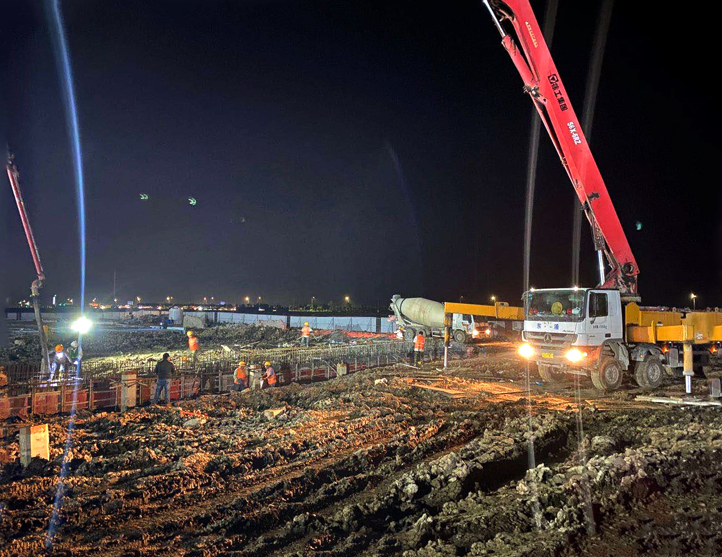 目前,現(xiàn)場日均施工人員數(shù)量160人、7臺挖機、2臺鏟車,分塊平行作業(yè),工作重心在于車間基礎墊層施工。為確保按時完成工程節(jié)點,施工單位在車間周邊布置四盞照明燈,組織部分班組夜間施工,夜間工地燈火通明猶如白晝,砌筑、運料、澆筑、開挖等各項工作有序展開。做好后勤保障工作,為夜間施工的工人提供夜宵、驅(qū)蚊水、藥品、雨衣等,保證工人師傅能夠持續(xù)健康作戰(zhàn)。為應對下雨天氣,現(xiàn)場配置各類水泵10余臺,確保當日下雨當日排清;為施工人員配置雨衣、雨鞋,做到部分工作雨天不停工。項目指揮部管理人員、監(jiān)理放棄節(jié)假日休息時間,挑燈夜戰(zhàn),對現(xiàn)場質(zhì)量、安全進行全天候監(jiān)督管理。項目參建各方以“白天正常干、夜間挑燈干,雨天不停干、節(jié)假日繼續(xù)干”的決心,力爭7月底完成廠房基礎墊層施工,為8月份鋼構吊裝奠定基礎。