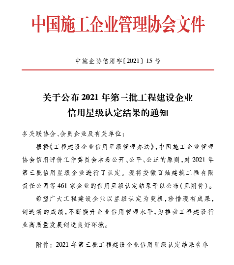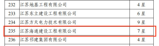 近日,從中國施工企業(yè)管理協(xié)會信用評價工作委員會傳來喜訊,江蘇海通建設工程有限公司獲得2021年第三批工程建設企業(yè)信用7星級認定,在全國第三批參加認定的461家企業(yè)中名列前茅。