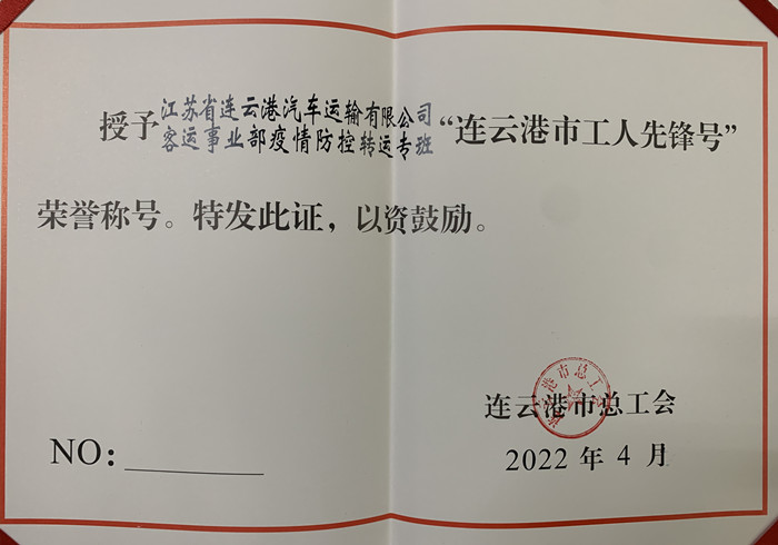 近日,從連云港市總工會(huì)傳來(lái)喜訊,汽車(chē)公司疫情防控轉(zhuǎn)運(yùn)專(zhuān)班被授予“連云港市工人先鋒號(hào)”榮譽(yù)稱號(hào)。